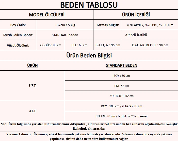 Ürün İçeriği : %70 Akrilik, %20 PBT, %10 Likra