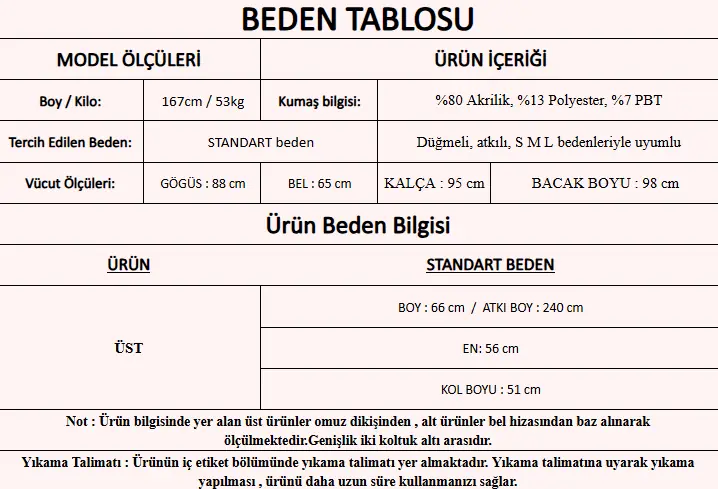 Ürün Boyu : 66 cm / Atkı 240 cm