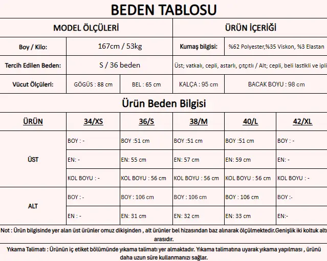 Ürün İçeriği : %62 Polyester,%35 Viskon, %3 Elastan