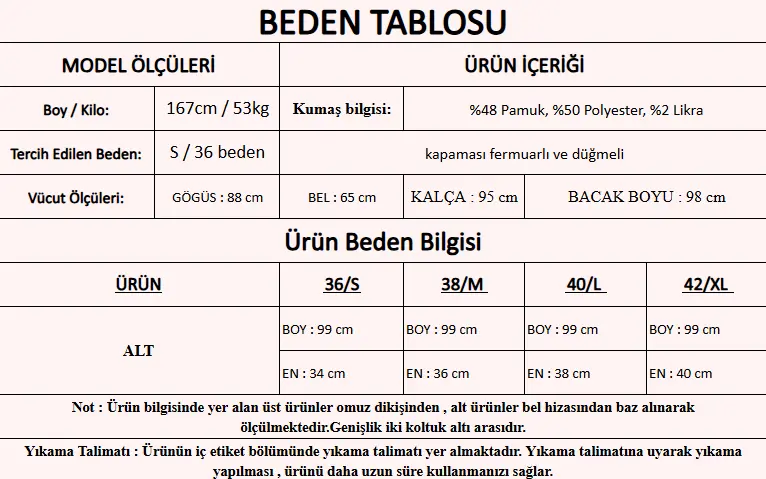 Ürün İçeriği : %48 Pamuk, %50 Polyester, %2 Likra