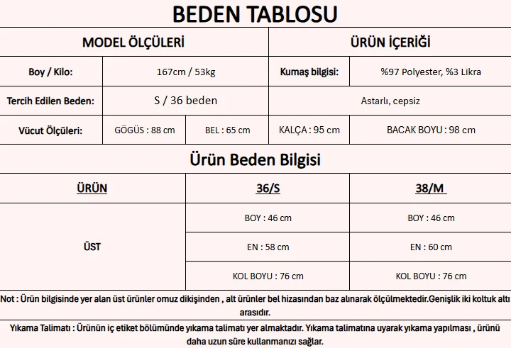 Ürün İçeriği : %97 Polyester, %3 Likra