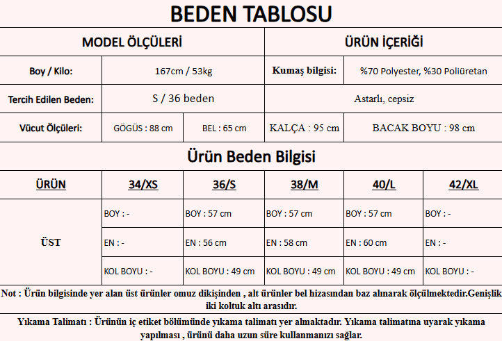 Ürün İçeriği : %70 Polyester, %30 Poliüretan