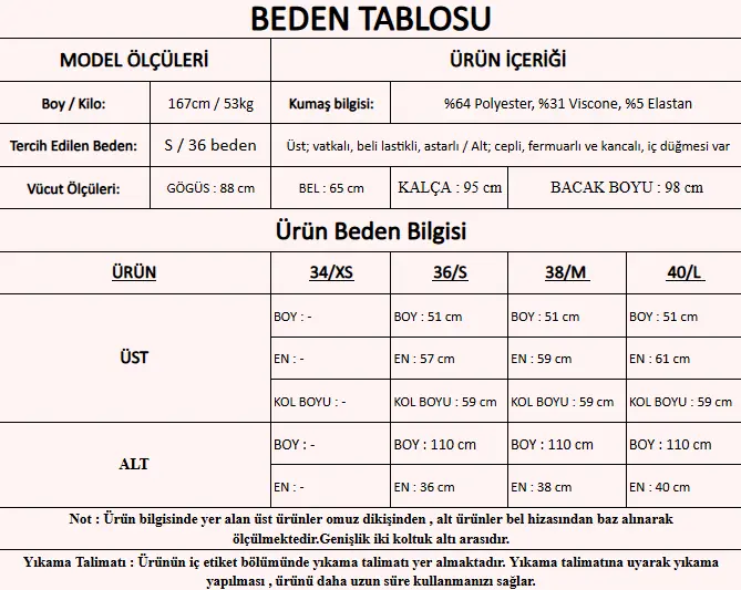 Ürün İçeriği : %64 Polyester, %31 Viscone, %5 Elastan