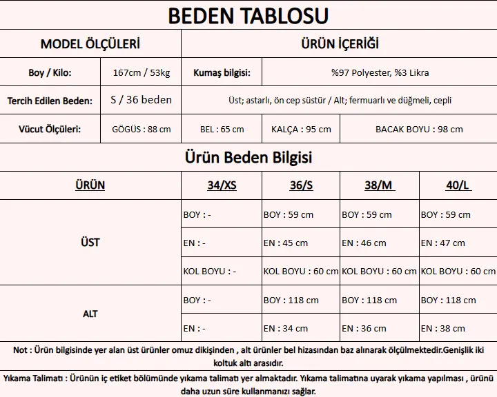 Ürün İçeriği               : %97 Polyester, %3 Likra