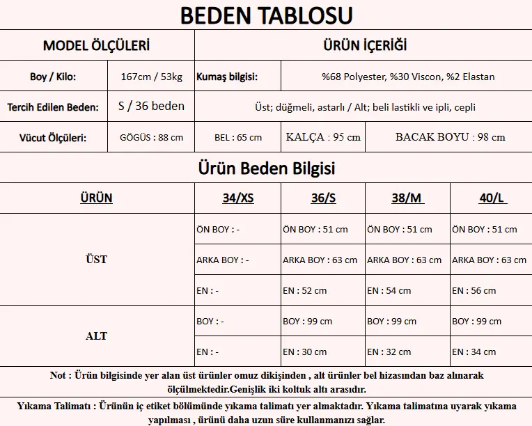 Ürün İçeriği : %68 Polyester, %30 Viscon, %2 Elastan