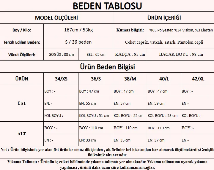 Ürün İçeriği : %63 Polyester, %34 Viskon, %3 Elastan