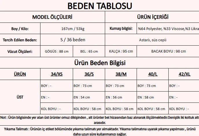 Ürün İçeriği : %64 Polyester, %33 Viscose,%3 Likra