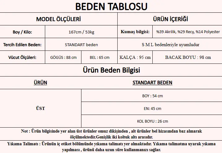 Ürün İçeriği : %39 Akrilik, %29 Recyled, %14 Polyester,%9 Naylon, %5 Yün, %4 Spandex