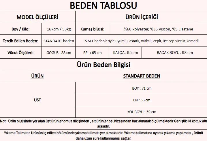 Ürün İçeriği               : %60 Polyester, %35 Viscon, %5 Elastane
