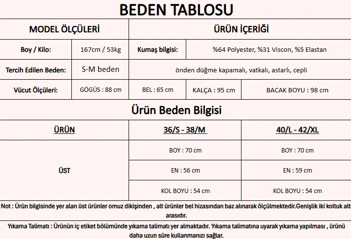 Ürün İçeriği : %64 Polyester, %31 Viscon, %5 Elastan