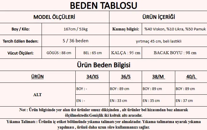 Ürün İçeriği : %40 Viskon, %10 Likra, %50 Pamuk